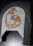 Weiter geht es mit der Rückenplatte plus Erhebung, auf die nach dem Lackieren dann das Symbol geklebt wird. Die Befestigung würde ich gerne verdeckt machen; sollte das nicht funktionieren, werden noch die vier typischen Gurtausschnitte nachgearbeitet.