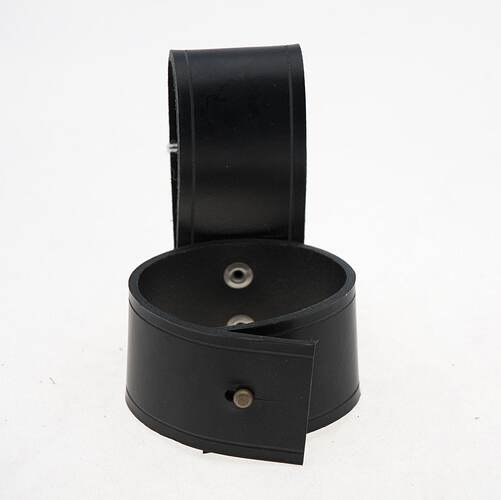 Das Bild zeigt auch keinen richtigen Druckknopf, sondern dass einen zu ähnlichem Zweck verwursteten Führungsnippel. Der geht noch viel schwerer ein und wenn das Leder eines Tages ausleiert, ist das Schwert nimmer sicher gehalten. Bevor Du sowas kaufst, beschaff Dir bei Lederhaus.de (o.ä. siehe Linkliste in der schmiedeschule) ein bissi Gurtleder und Zubehör und schraube / niete Dir das Lederzeugs für Deinen Mando selbst zusammen, passgenau, in Deiner Farbe und mit soliden Nieten und Druckknöpfen. Das ist nämlich gar nicht schwierig wenn man sich nur drauf einlässt.