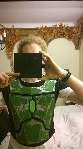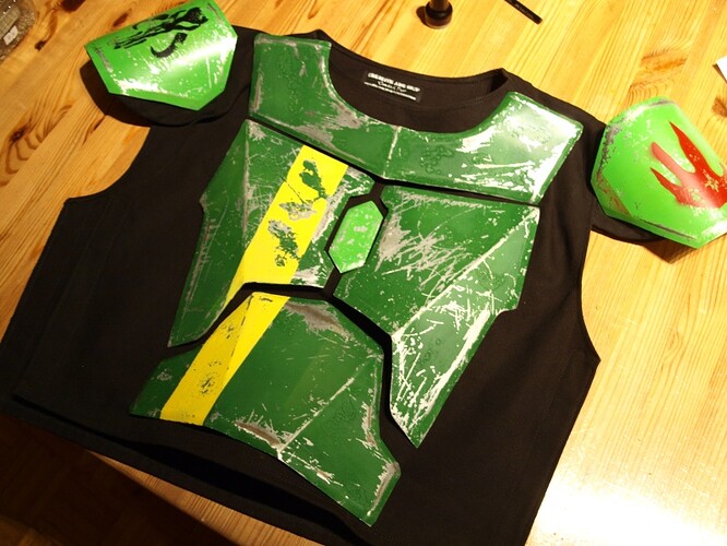Hab am WE die Rückenplatte fertig gemacht und bemalt, Rüstungsteile mal abgeranzt und begonnen die Druckknöpfe auf die Weste zu nähen, hier mal kurz der Zwischenstand. Mit dem Airbrush werd ich jetzt noch Symbole und Verzierungen drauf tun