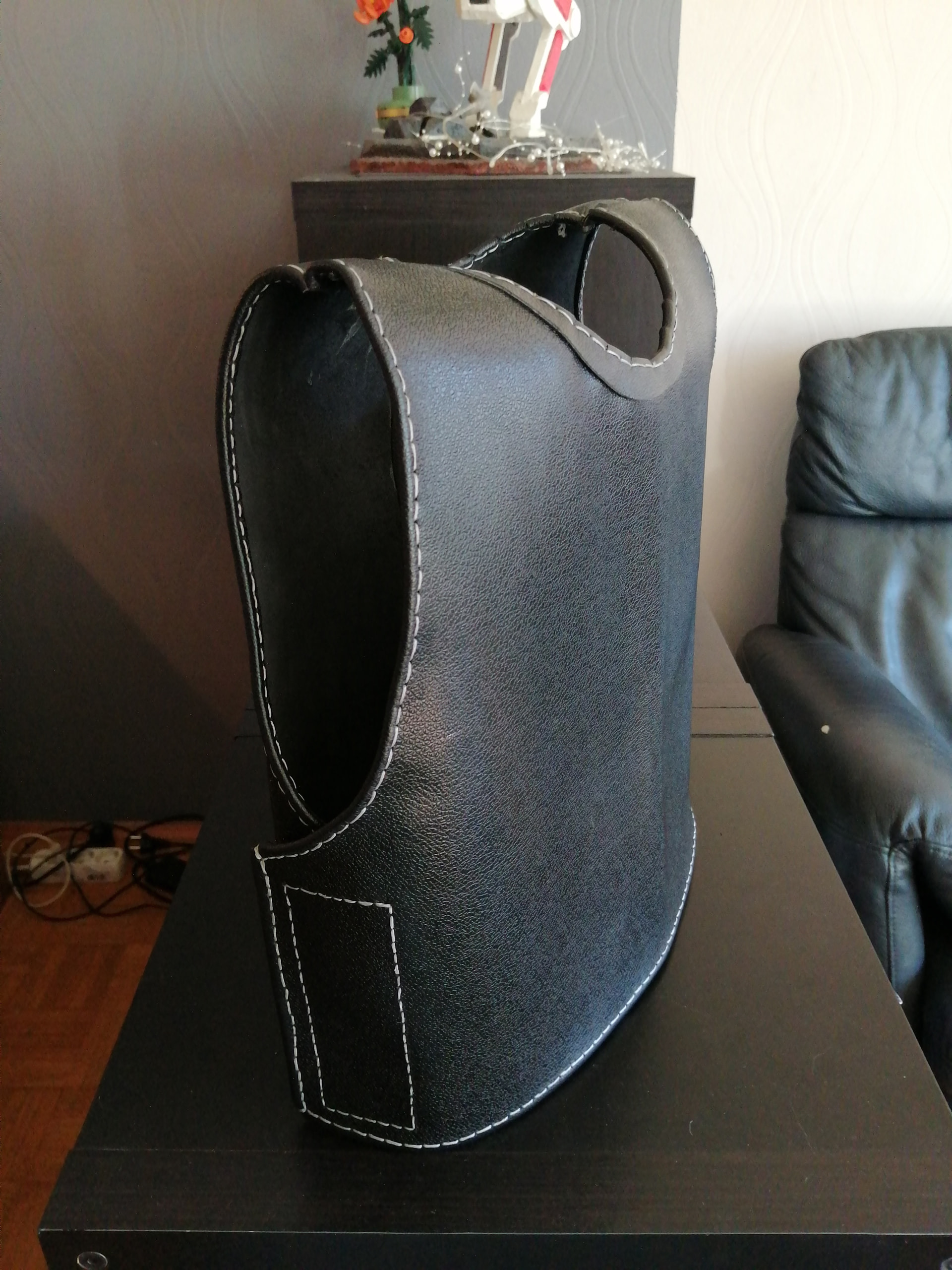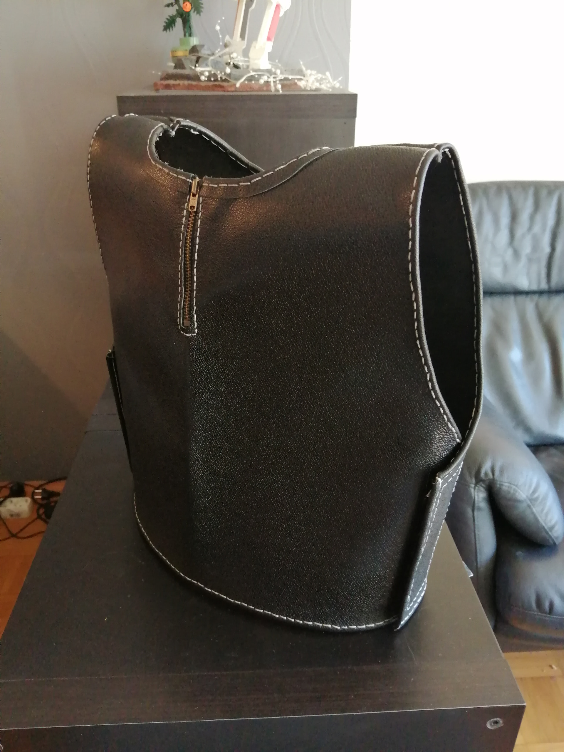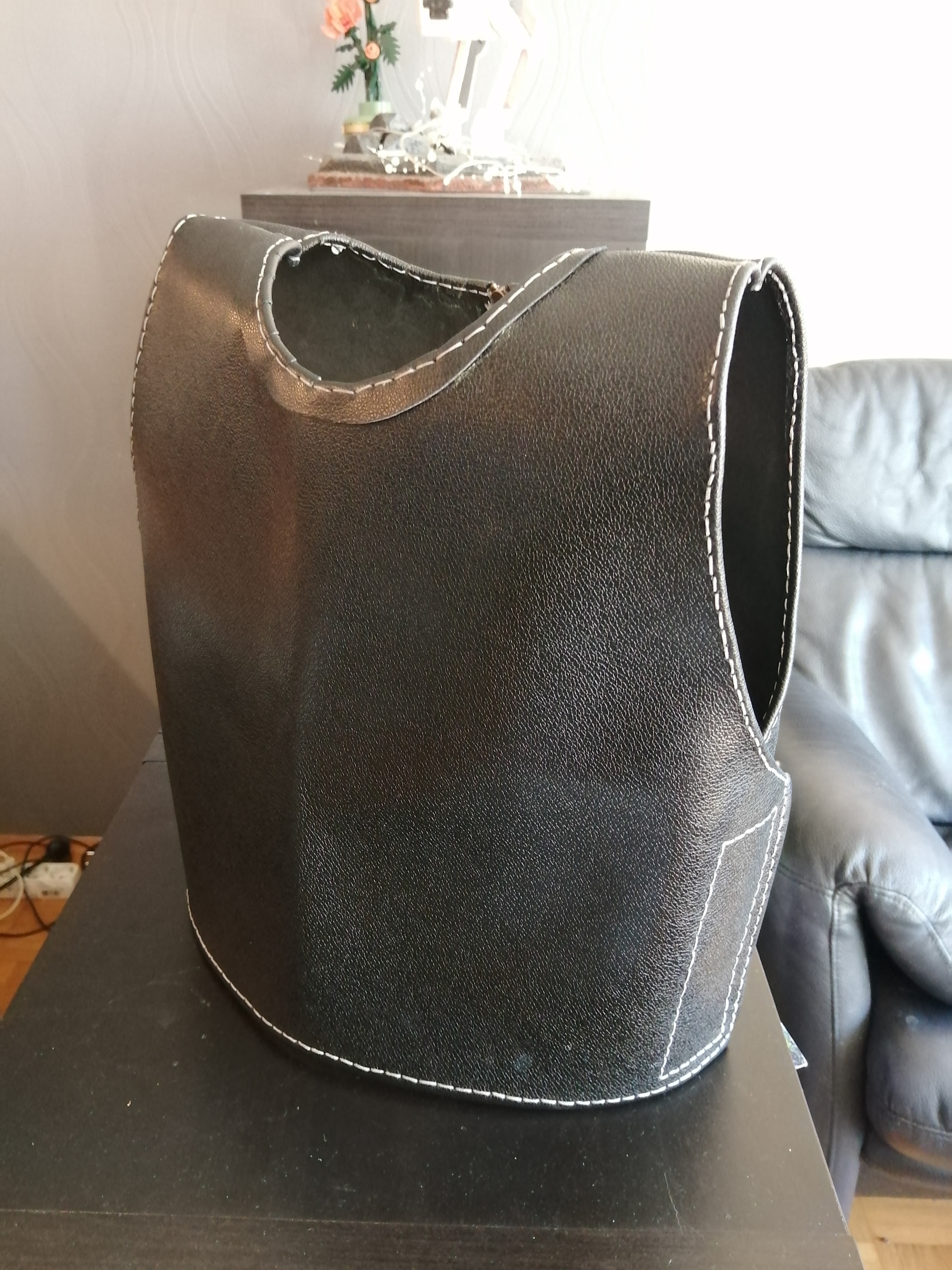 Schlichtes schwarzes Leder, glaube 1,2mm dick. Schulterlappen sind schon fertig und momentan bin ich dabei die Nähte um zu nähen.