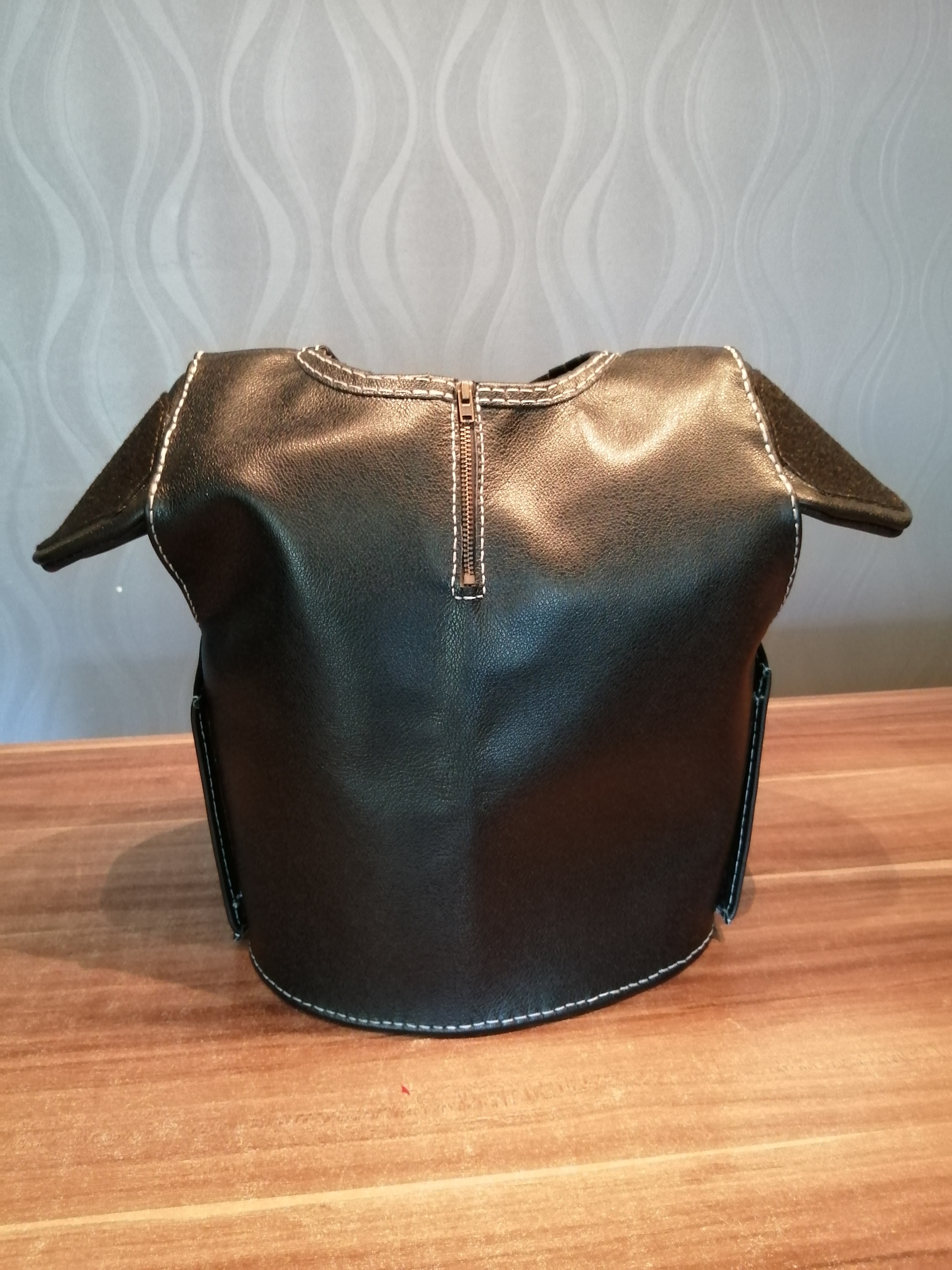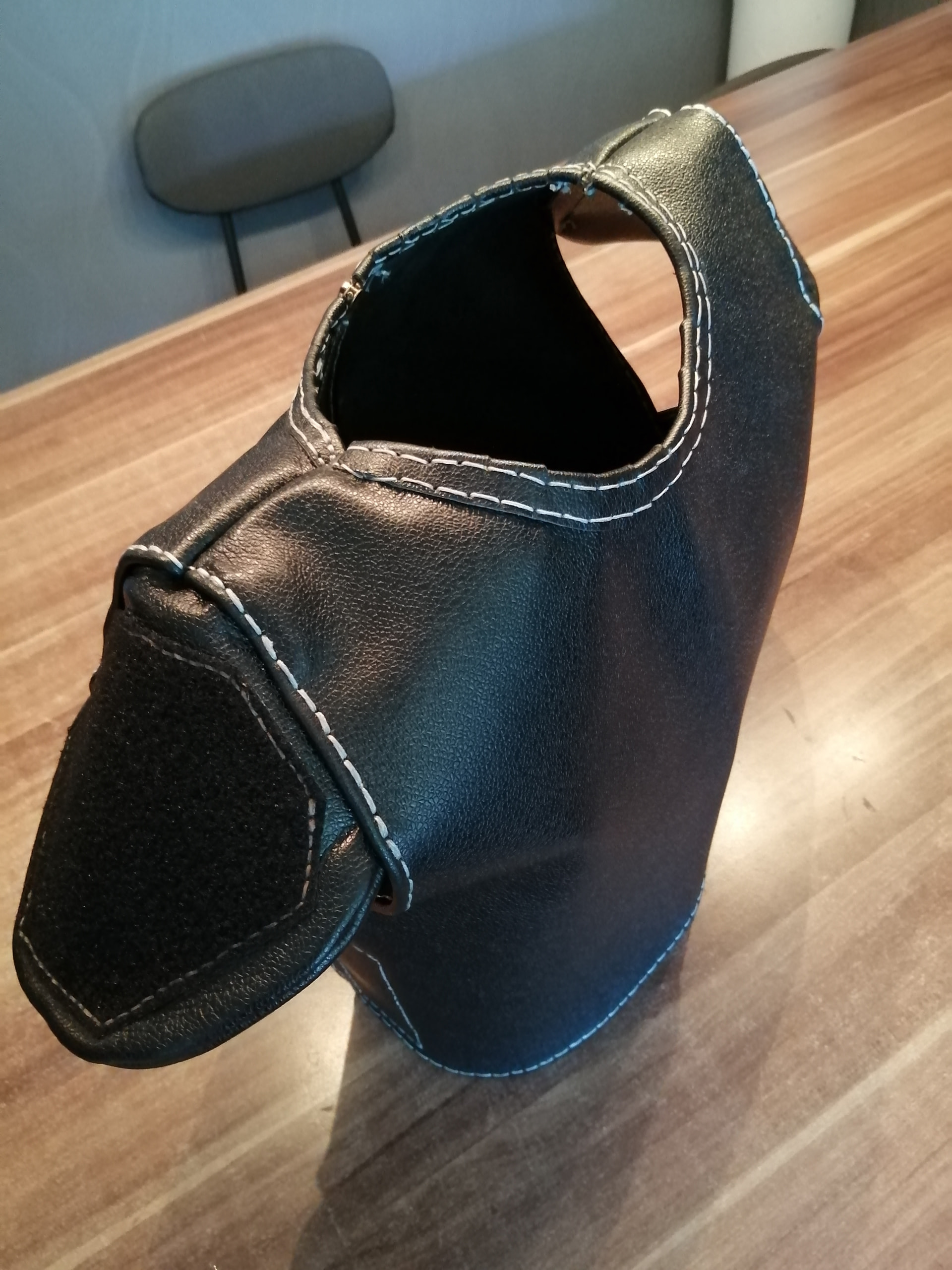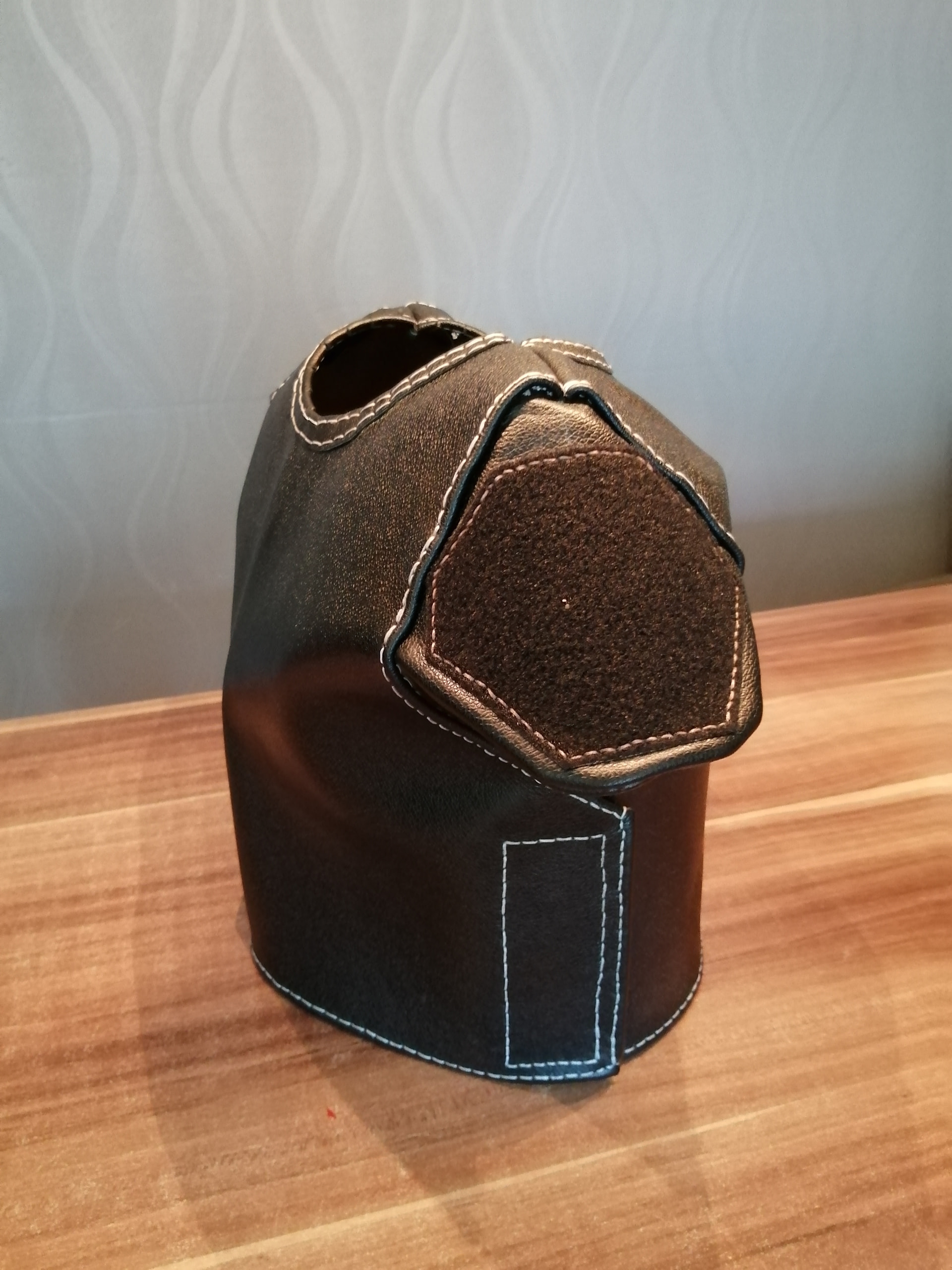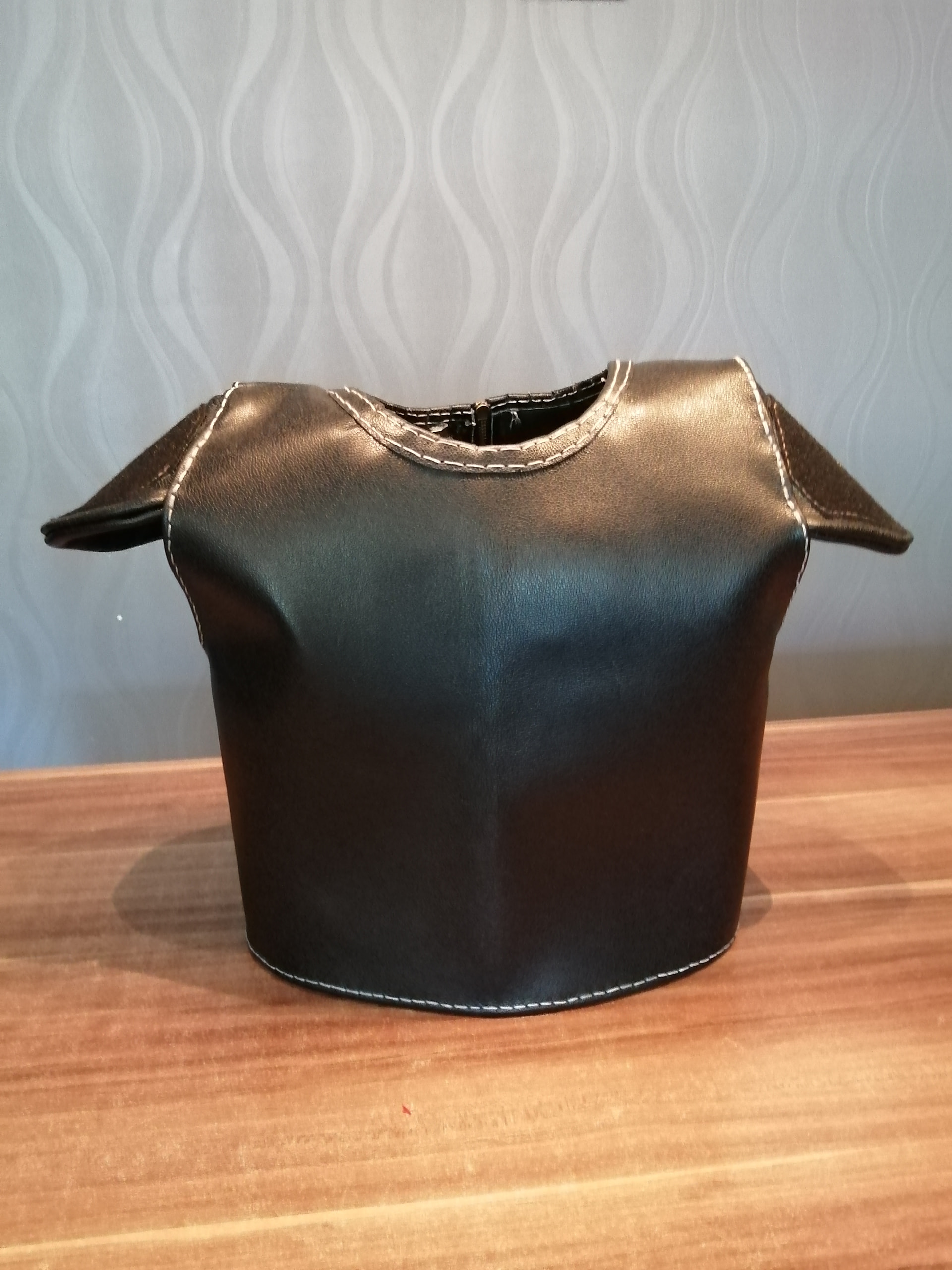Schlichtes schwarzes Leder, glaube 1,2mm dick. Schulterlappen sind schon fertig und momentan bin ich dabei die Nähte um zu nähen.