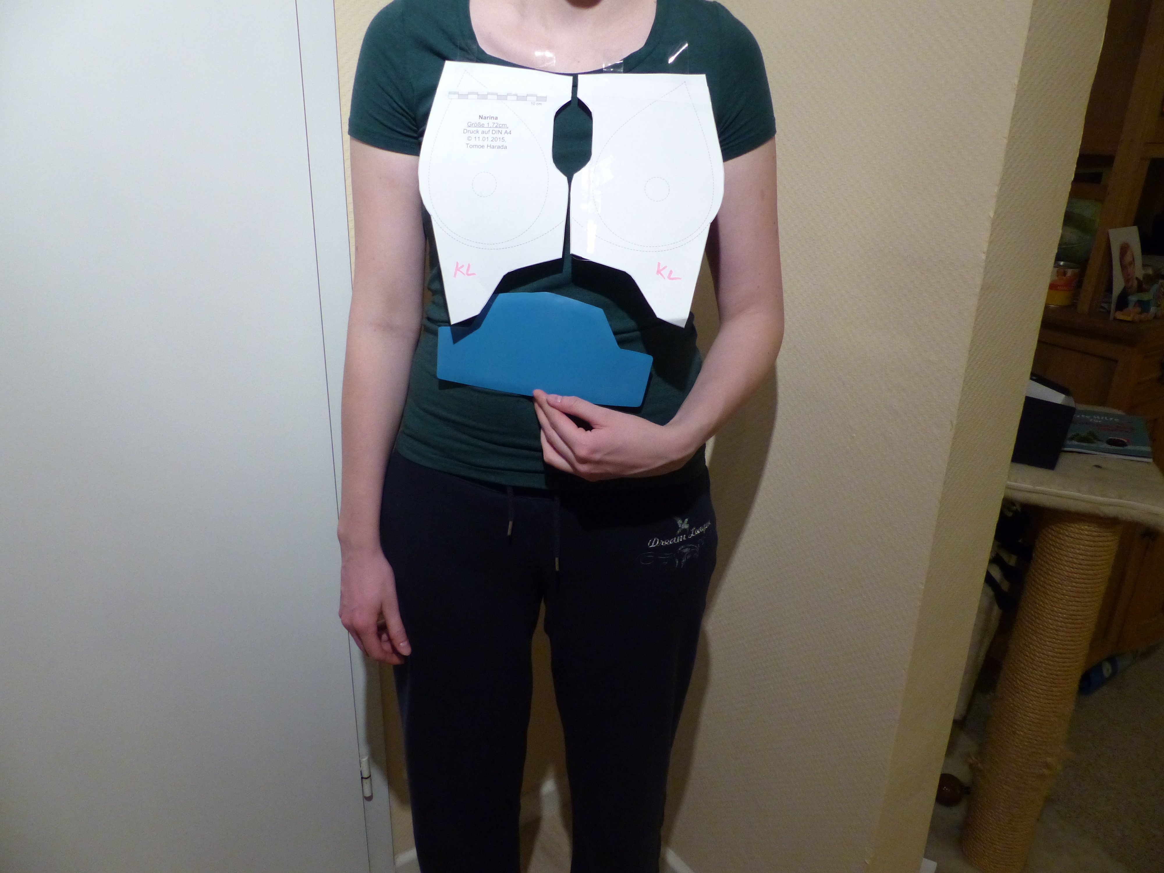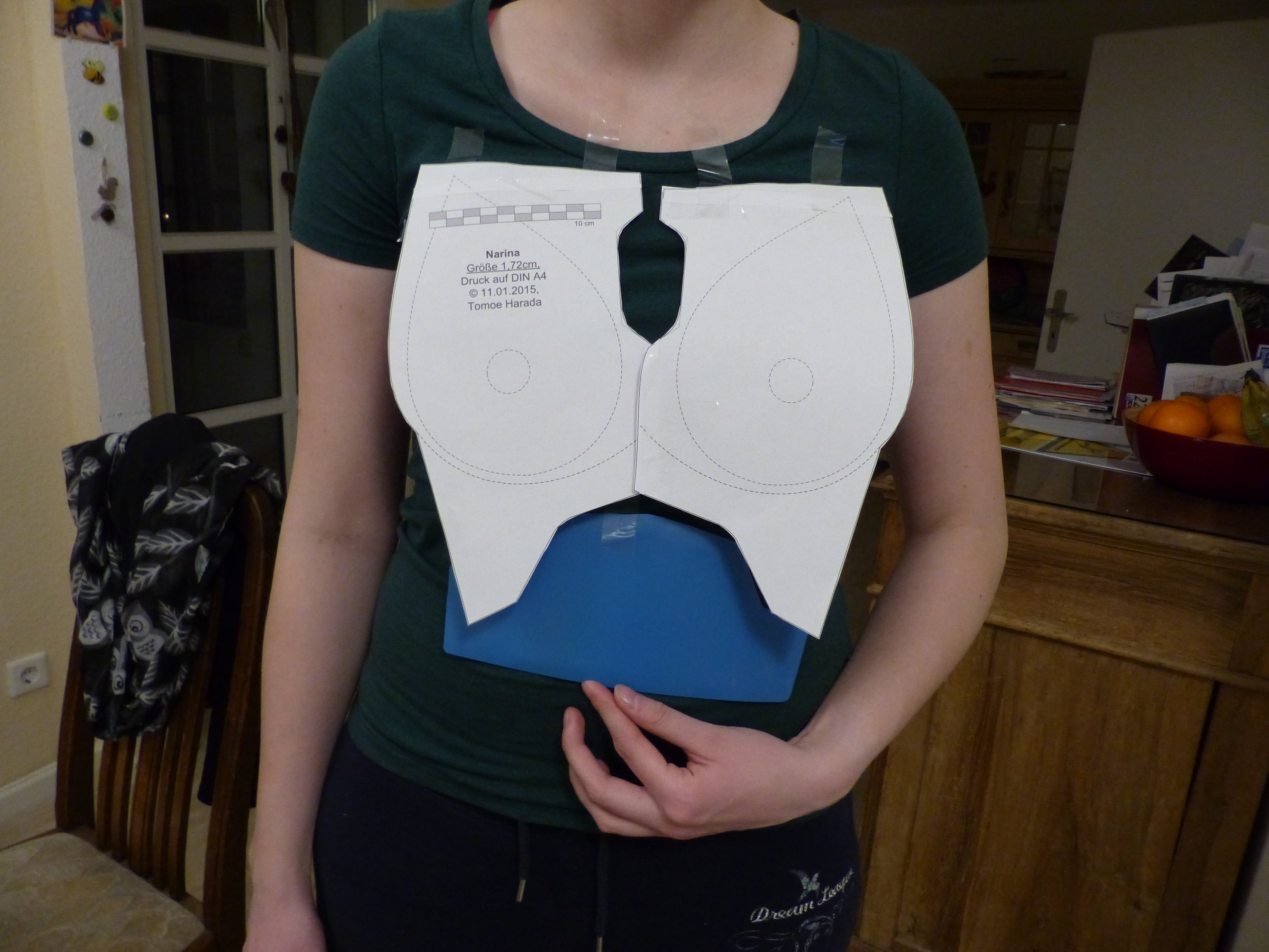 habe nochmal eine neue Anprobe mit der tatkräftigen Unterstützung von Aliza gemacht. Die Platten werden dann geknickt, nicht gefaltet.