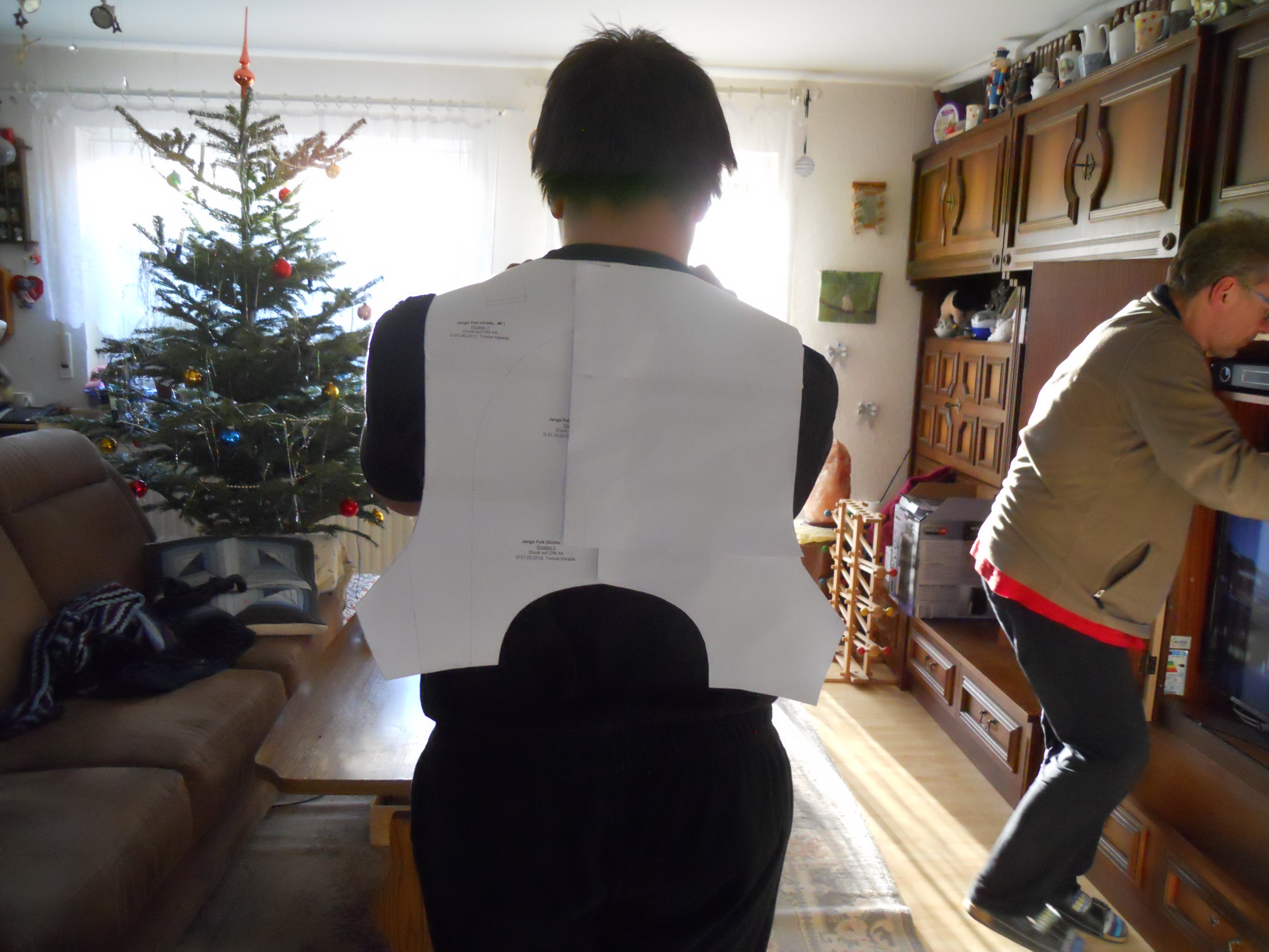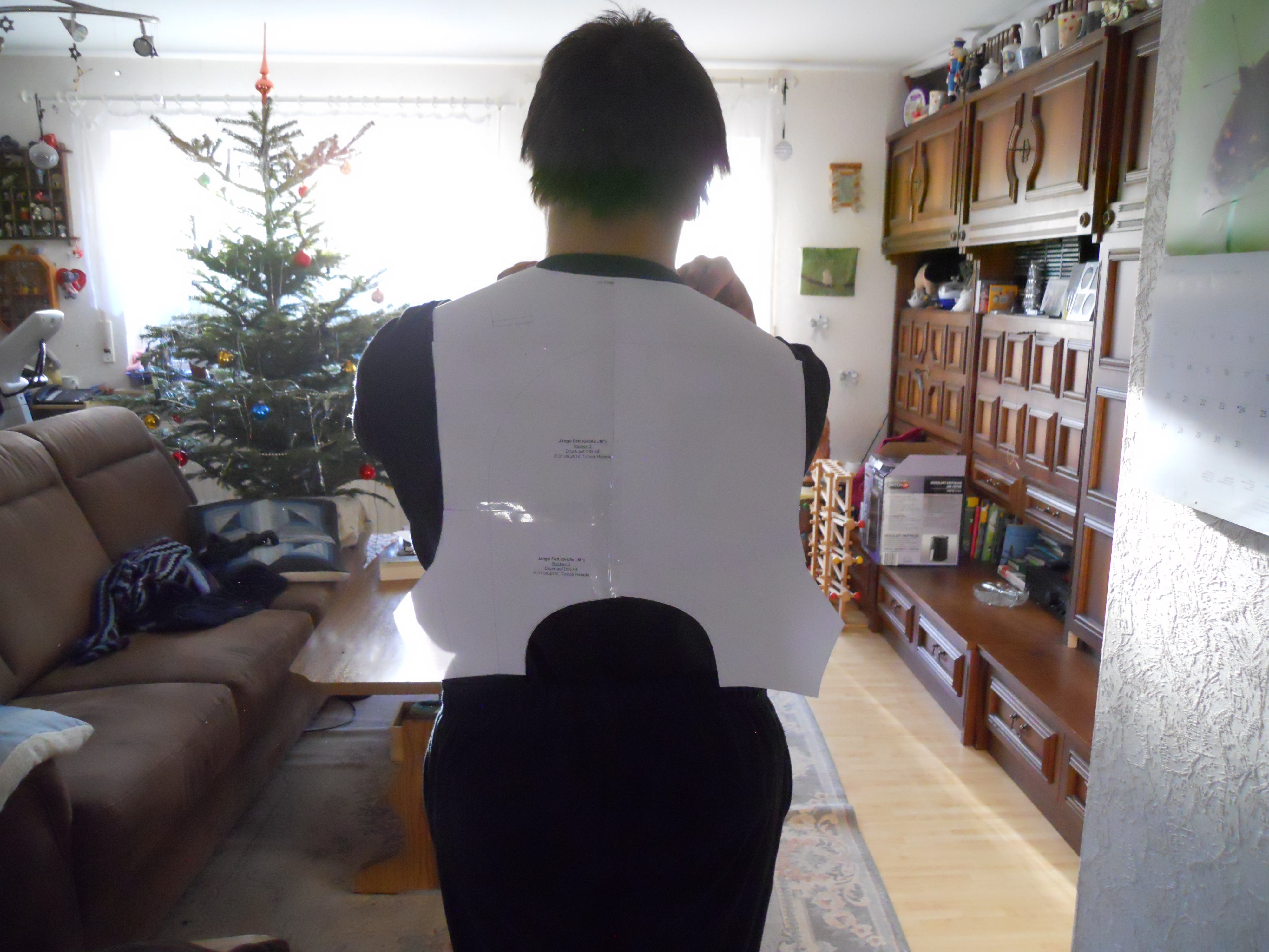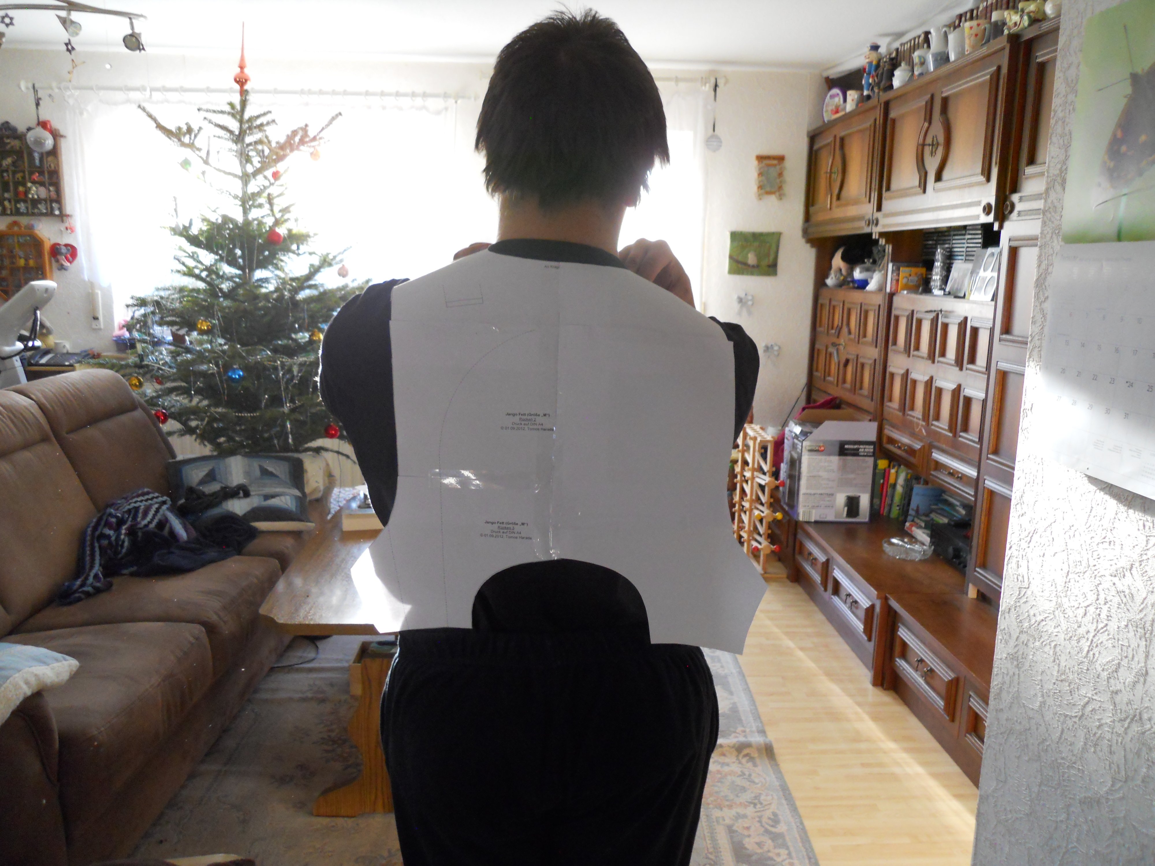 Was noch etwas kompliziert werden kann ist dass ich abgenommen hab. Ich werd die Platten also noch nacharbeiten müssen. Aber meine Mutter hat mir eine Probeweste genäht und da kann ich das ganze nochmal mit den Papierplatten überprüfen.