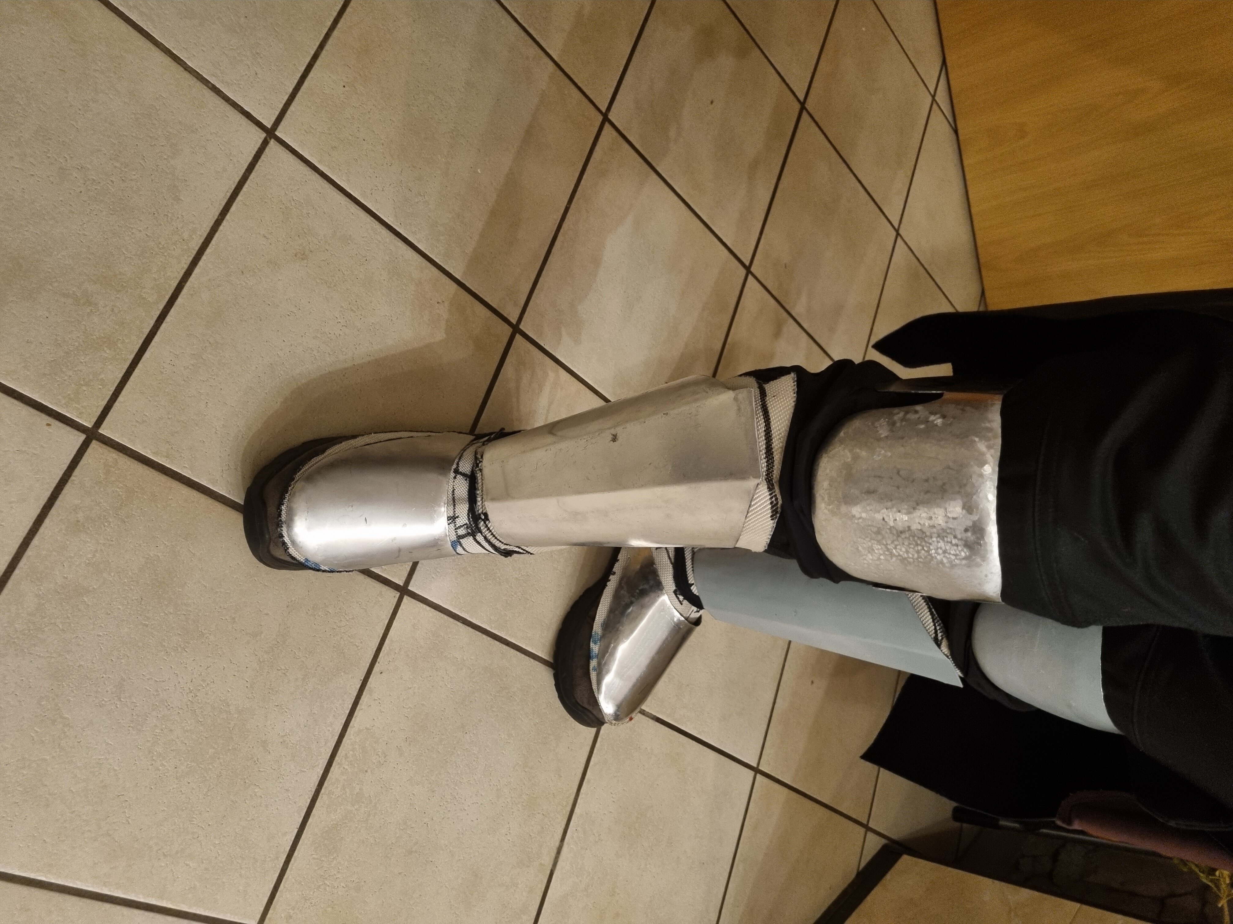 Stiefel und Schienbein platten hab ich auf Feuerwehrschlauch Stulpen gepackt. Das ist recht angenehm Anzuziehen, ich hab beides in einem, und brauch keine extra Schuhe an die ich was packe. Außerdem scheuert so keine Kante am Schuhwerk.