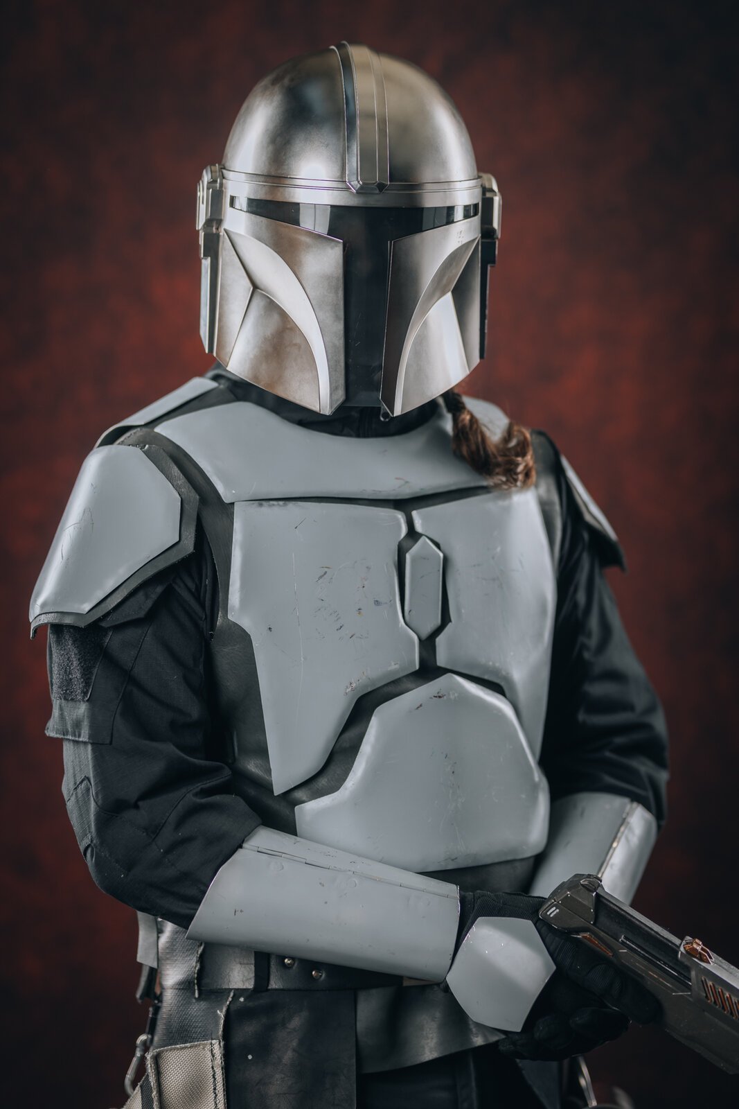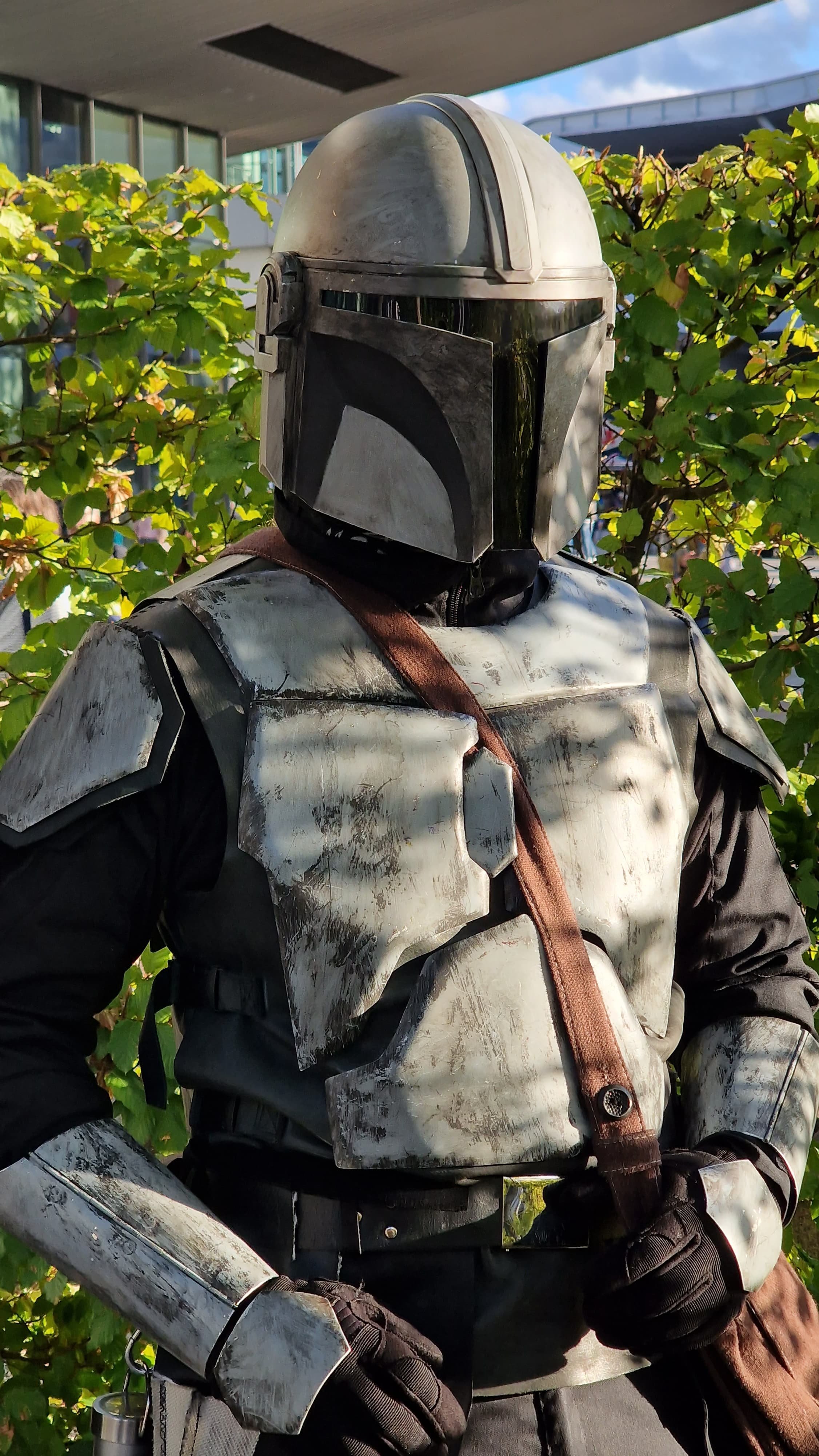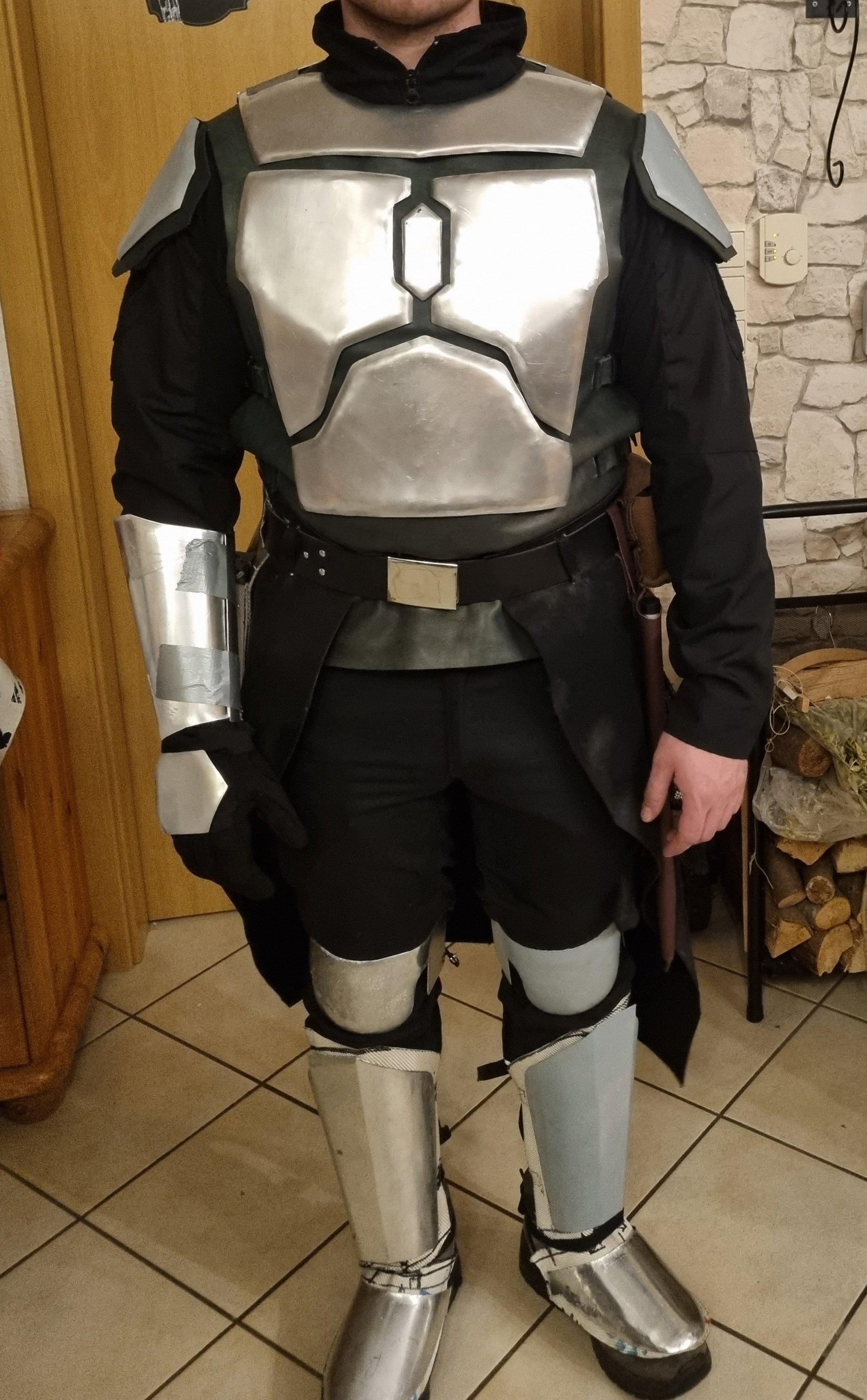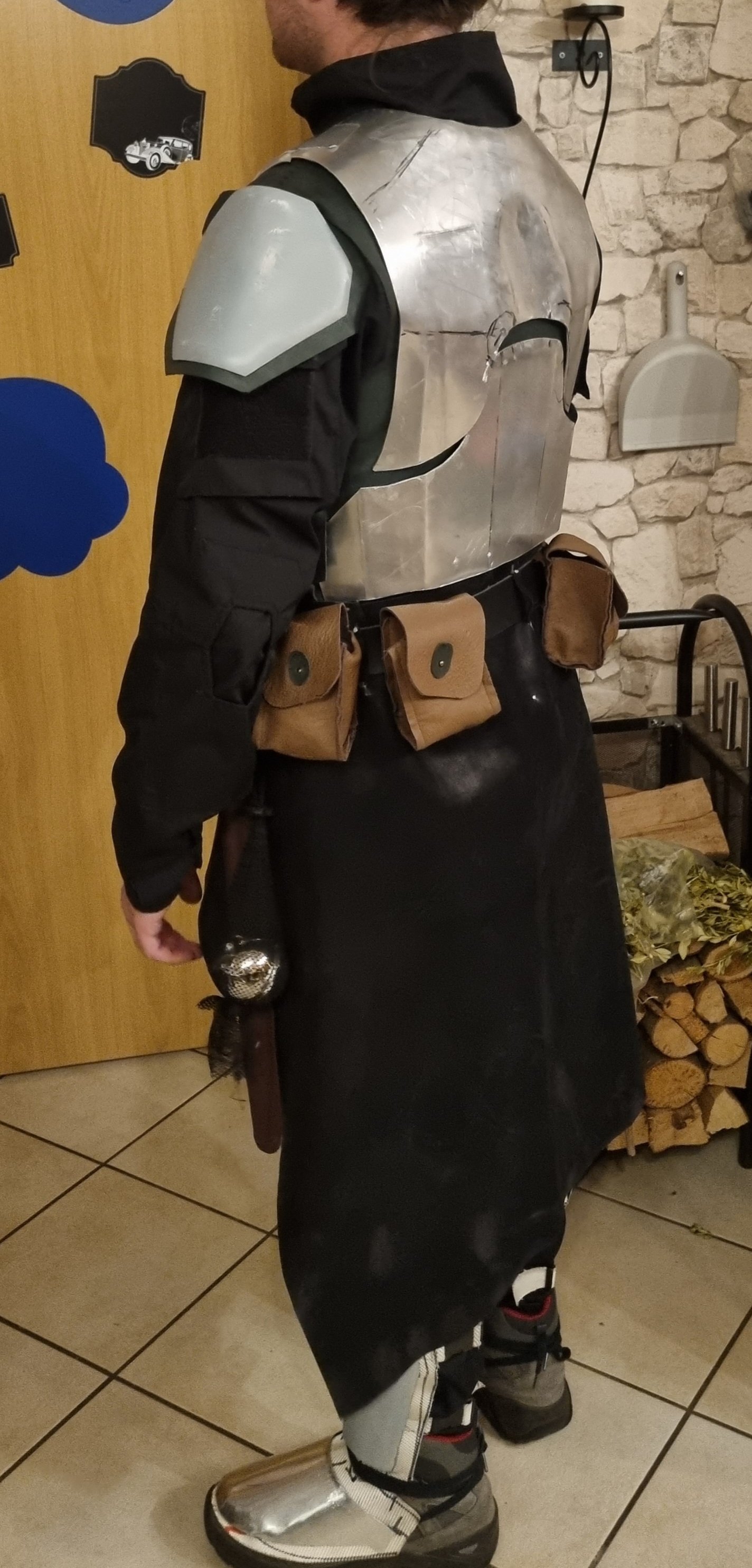 Die Weste wirft noch ein paar unschöne Falten an der Seite und sollte außerdem entweder spätestens beim Gürtel enden oder zumindest unten einen schöneren Abschluss haben, die Schulterflügel würde ich auch oben noch etwas mehr annähen (vgl. Jangos Weste).