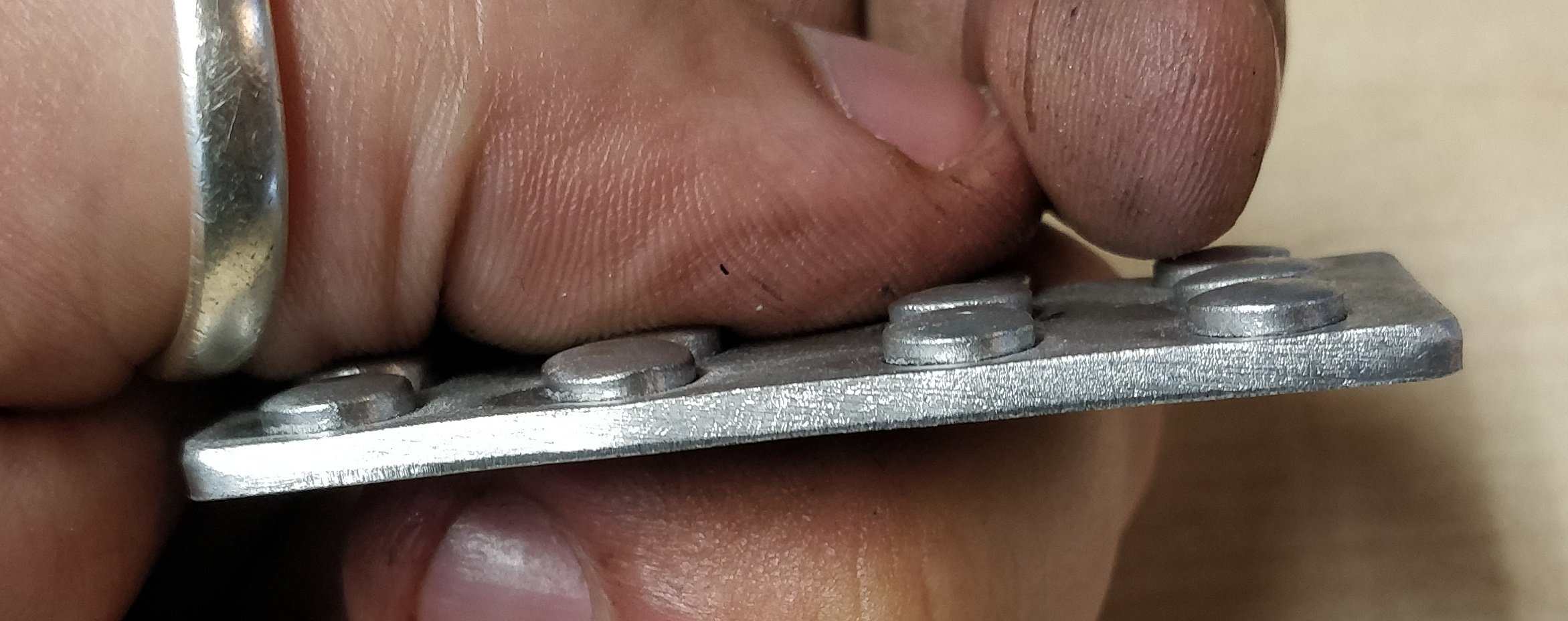 Erst ein kleines Plättchen ausschneiden und anreißen, wo die Knöpfe sein sollen. Material 2,5mm Alu