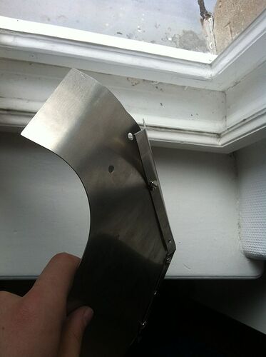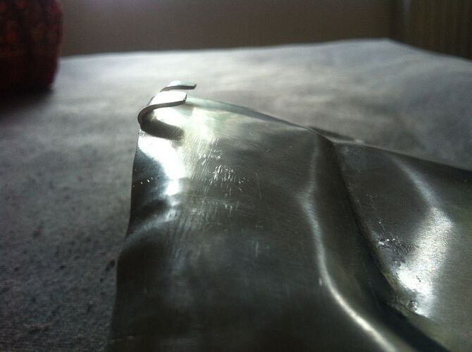 Nun der knifflige Teil, nämlich das Umbiegen der oberen Sektion des Seitenteils (alles oberhalt der vierten Schraube, von unten gezählt). Dadurch, dass der Keil reingedremelt wurde, entsteht hier nun keine “Metallwulst”. Mit etwas Kraft habe ich also den oberen Teil herübergebogen. Nun stimmt aber der Winkel des “Überstands” nicht, wo anschließend die Löcher durchgebohrt wurden.